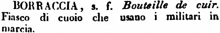 | Borraccia - s. f. Bouteille de cuir. Fiasco di cuoio che usano i militari in marcia. [immagine] |