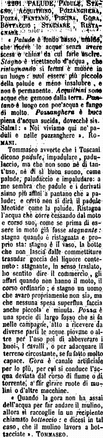 | Palude, Padule, Stagno, Acquitrino, Pozzanghera, Pozza, Pantano, Piscina, Gora, Bottaccio; Stagnare, Ristagnare - «Palude è fondo basso, umido, che riceve le acque senza avere scesa o china da cui farle uscire. Stagno è ricettacolo d'acqua, che ristagnando si ferma e muore in un luogo: suol essere più piccolo della palude e meno insalubre, e non è permanente. Acquitrini sono acque che gemono dalla terra. Pantano è luogo con poc'acqua e fango di molto. Pozzanghera è buca piena d'acqua sucida, dovecchè sia. Salmi: «Noi viviamo qui ne' paduli e nelle pozzanghere». Romani.