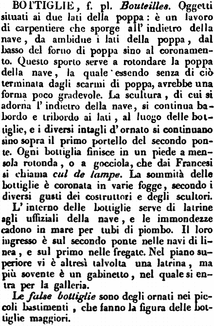 Bottiglie - f. pl. Bouteilles. Oggetti situati ai due lati della poppa: è un lavoro di carpentiere che sporge all'indietro della nave, da ambidue i lati della poppa, dal basso del forno di poppa sino al coronamento. Questo sporto serve a rotondare la poppa della nave, la quale essendo senza di ciò terminata dagli scarmi di poppa, avrebbe una forma poco gradevole. La scultura, di cui si adorna l'indietro della nave, si continua babordo e tribordo ai lati, al luogo delle bottiglie, e i diversi intagli d'ornato si continuano sino sopra il primo portello del secondo ponte. Ogni bottiglia finisce in un piede a mensola rotonda, o a gocciola, che dai Francesi si chiama cul de lampe. La sommità delle bottiglie è coronata in varie fogge, secondo i diversi gusti dei costruttori e degli scultori.