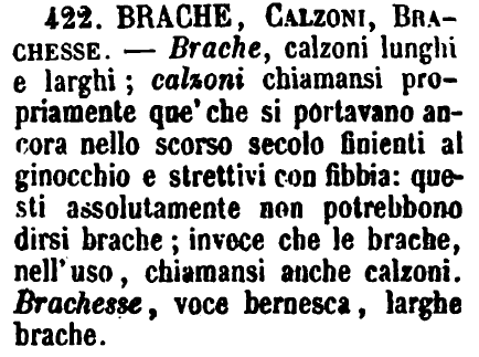 | Brache, Calzoni, Brachesse - Brache, calzoni lunghi e larghi; calzoni chiamansi propriamente que' che si portavano ancora nello scorso secolo finienti al ginocchio e strettivi con fibbia: questi assolutamente non potrebbono dirsi brache; invece che le brache, nell'uso, chiamansi anche calzoni. Brachesse, voce bernesca, larghe brache. [immagine] |