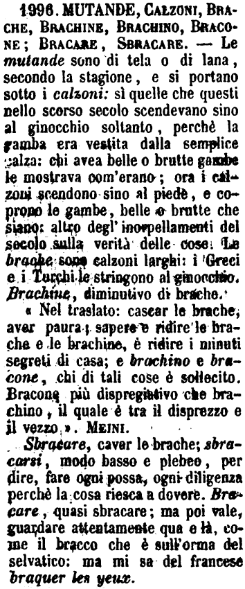 Mutande, Calzoni, Brache, Brachine, Brachino, Bracone; Bracare, Sbracare - Le mutande sono di tela o di lana, secondo la stagione, e si portano sotto i calzoni: sì quelle che questi nello scorso secolo scendevano sino al ginocchio soltanto, perchè la gamba era vestita dalla semplice calza: chi avea belle o brutte gambe le mostrava com'erano; ora i calzoni scendono sino al piede, e coprono le gambe, belle o brutte che siano: altro degl'inorpellamenti del secolo sulla verità delle cose. Le brache sono calzoni larghi: i Greci e i Turchi le stringono al ginocchio. Brachine, diminutivo di brache.