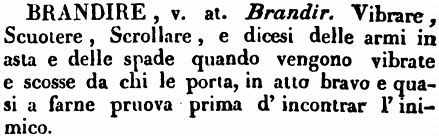 | Brandire - v. at. Brandir. Vibrare, Scuotere, Scrollare, e dicesi delle armi in asta e delle spade quando vengono vibrate e scosse da chi le porta, in atto bravo e quasi a farne pruova prima d'incontrar l'inimico. [immagine] |