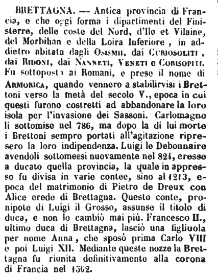 | Brettagna - Antica provincia di Francia, e che oggi forma i dipartimenti del Finisterre, delle coste del Nord, d'Ile et Vilaine, del Morbihan e della Loira Inferiore, in addietro abitata dagli Osismii, dai Curiosoliti, dai Ridoni, dai Nanneti, Veneti e Corisopiti. Fu sottoposta ai Romani, e prese il nome di Armorica, quando vennero a stabilirvisi i Brettoni verso la metà del secolo V., epoca in cui questi furono costretti ad abbandonare la loro isola per l'invasione dei Sassoni. Carlomagno li sottomise nel 786, ma dopo la di lui morte i Brettoni sempre portati all'agitazione ripresero la loro indipendenza. Luigi le Debonnaire avendoli sottomessi nuovamente nel 824, eresse a ducato quella provincia, la quale in appresso fu divisa in varie contee, sino al 1213, epoca del matrimonio di Pietro de Dreux con Alice erede di Brettagna. Questo conte, pronipote di Luigi il Grosso, assunse il titolo di duca, e non lo cambiò mai più. Francesco II., ultimo duca di Brettagna, lasciò una figliuola per nome Anna, che sposò prima Carlo VIII e poi Luigi XII. Mediante queste nozze la Brettagna fu riunita definitivamente alla corona di Francia nel 1562. [immagine] |