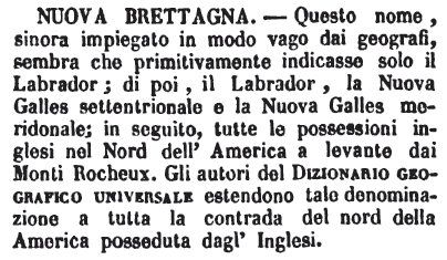 | Nuova Brettagna - Questo nome, sinora impiegato in modo vago dai geografi, sembra che primitivamente indicasse solo il Labrador; di poi, il Labrador, la Nuova Galles settentrionale e la Nuova Galles meridionale; in seguito, tutte le possessioni inglesi nel Nord dell'America a levante dai Monti Rocheux. Gli autori del Dizionario geografico iniversale estendono tale denominazione a tutta la contrada del nord della America posseduta dagl'Inglesi. [immagine] |