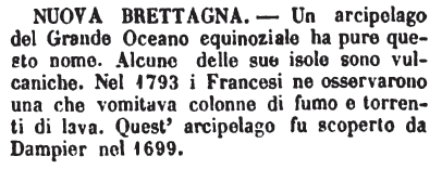 | Nuova Brettagna - Un arcipelago del Grande Oceano equinoziale ha pure questo nome. Alcune delle sue isole sono vulcaniche. Nel 1793 i Francesi ne osservarono una che vomitava colonne di fumo e torrenti di lava. Quest'arcipelago fu scoperto da Dampier nel 1699. [immagine] |