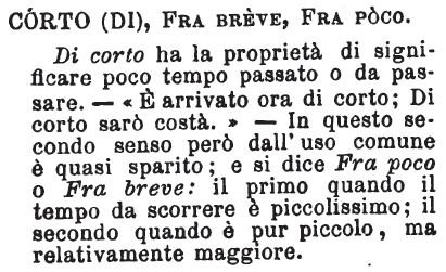 | Corto (di), Fra breve, Fra poco - Di corto ha la proprietà di significare poco tempo passato o da passare. « È arrivato ora di corto; Di corto sarò costà». In questo secondo senso però dall'uso comune è quasi sparito; e si dice Fra poco o Fra breve: il primo quando il tempo da scorrere è piccolissimo; il secondo quando è pur piccolo, ma relativamente maggiore. [immagine] |