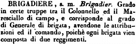 | Brigadiere - S. m. (Mil.) [D'A.] Grado nella milizia, ed è quell'Uffiziale generale che comanda una brigata; ora però si chiama in alcun luogo General maggiore, in altri Maggior generale; in Francia ed in Italia sotto il governo di Napoleone si chiamò Generale di brigata, ed ora colà Maresciallo di campo.