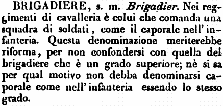| Brigadiere - s. m. Brigadier. Grado in certe truppe tra il Colonnello ed il Maresciallo di campo, e corrisponde al grado di Generale di brigata, avendone le attribuzioni ed il comando, poichè ogni brigata vien composta di due reggimenti. [immagine] |