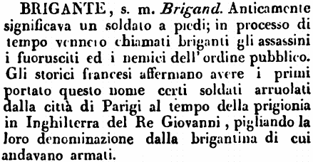 | Brigante - s. m. Brigand. Anticamente significava un soldato a piedi; in processo di tempo vennero chiamati briganti gli assassini i fuorusciti ed i nemici dell'ordine pubblico. Gli storici francesi affermano avere i primi portato questo nome certi soldati arruolati dalla città di Parigi al tempo della prigionia in Inghilterra del Re Giovanni, pigliando la loro denominazione dalla brigantina di cui andavano armati. [immagine] |