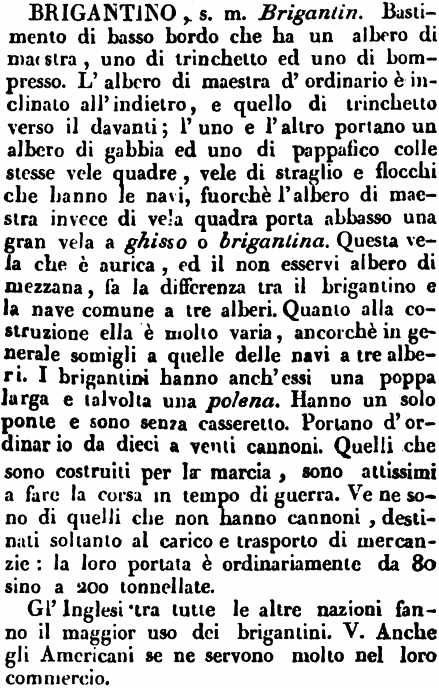 | Brigantino - s. m. Brigantin. Bastimento di basso bordo che ha un albero di maestra, uno di trinchetto ed uno di bompresso. L'albero di maestra d'ordinario è inclinato all'indietro, e quello di trinchetto verso il davanti; l'uno e l'altro portano un albero di gabbia ed uno di pappafico colle stesse vele quadre, vele di straglio e flocchi che hanno le navi, fuorchè l'albero di maestra invece di vela quadra porta abbasso una gran vela a ghisso o brigantina. Questa vela che è aurica, ed il non esservi albero di mezzana, fa la differenza tra il brigantino e la nave comune a tre alberi. Quanto alla costruzione ella è molto varia, ancorchè in generale somigli a quelle delle navi a tre alberi. I brigantini hanno anch'essi una poppa larga e talvolta una polena. Hanno un solo ponte e sono senza casseretto. Portano d'ordinario da dieci a venti cannoni. Quelli che sono costruiti per la marcia, sono attissimi a fare la corsa in tempo di guerra. Ve ne sono di quelli che non hanno cannoni, destinati soltanto al carico e trasporto di mercanzie: la loro portata è ordinariamente da 80 sino a 200 tonnellate.