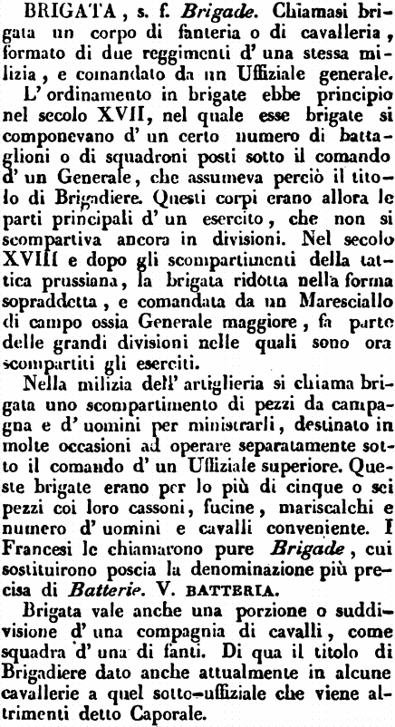 | Brigata - s. f. Brigade. Chiamasi brigata un corpo di fanteria o di cavalleria, formato di due reggimenti d'una stessa milizia, e comandato da un Uffiziale generale.