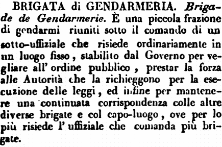 | Brigata di Gendarmeria - Brigade de Gendarmerie. È una piccola frazione di gendarmi riuniti sotto il comando di un sotto-uffiziale che risiede ordinariamente in un luogo fisso, stabilito dal Governo per vegliare all'ordine pubblico, prestar la forza alle Autorità che la richieggono per la esecuzione delle leggi, ed infine per mantenere una continuata corrispondenza colle altre diverse brigate e col capo-luogo, ove per lo più risiede l'uffiziale che comanda più brigate. [immagine] |