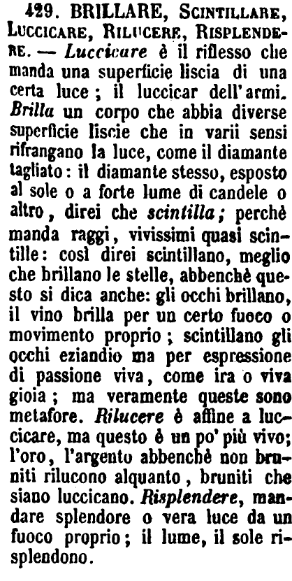 | Brillare, Scintillare, Luccicare, Rilucere, Risplendere - Luccicare è il riflesso che manda una superficie liscia di una certa luce; il luccicar dell’armi. Brilla un corpo che abbia diverse superficie liscie che in varii sensi rifrangano la luce, come il diamante tagliato: il diamante stesso, esposto al sole o a forte lume di candele o altro, direi che scintilla; perchè manda raggi, vivissimi quasi scintille: così direi scintillano, meglio che brillano le stelle, abbenchè questo si dica anche: gli occhi brillano, il vino brilla per un certo fuoco o movimento proprio; scintillano gli occhi eziandio ma per espressione di passione viva, come ira o viva gioia; ma veramente queste sono metafore. Rilucere è affine a luccicare, ma questo è un po’ più vivo; l’oro, l’argento abbenchè non bruniti rilucono alquanto, bruniti che siano luccicano. Risplendere, mandare splendore o vera luce da un fuoco proprio; il lume, il sole risplendono. [immagine] |