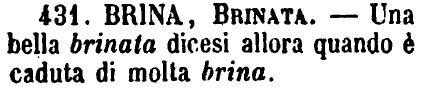 | Brina, Brinata - Una bella brinata dicesi allora quando è caduta di molta brina. [immagine] |