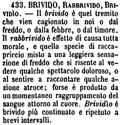 | Brivido, Rabbrivido, Brividio - Il brivido è quel tremito che vien cagionato in noi o dal freddo, o dalla febbre, o dal timore. Il rabbrivido è effetto di causa tutta morale, e quella specie di raccapriccio misto a una leggiera sensazione di freddo che si risente al vedere qualche spettacolo doloroso, o al sentire a raccontare qualche azione atroce; forse è prodotto da un momentaneo raggruppamento del sangue attorno al cuore. Brividìo è brivido più continuato e ripetuto a brevi intervalli. [immagine] |