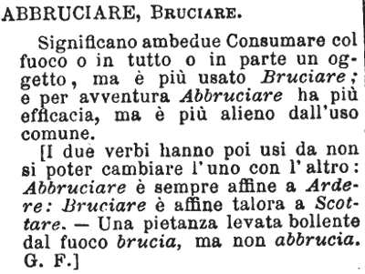 [I due verbi hanno poi usi da non si poter cambiare l'uno con l'altro: Abbruciare è sempre affine a Ardere: Bruciare è affine talora a Scottare. Una pietanza levata bollente dal fuoco brucia, ma non abbrucia. G. F.] [immagine] |