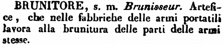 | Brunitore - s. m. Brunisseur. Artefice, che nelle fabbriche delle armi portatili lavora alla brunitura delle parti delle armi stesse. [immagine] |