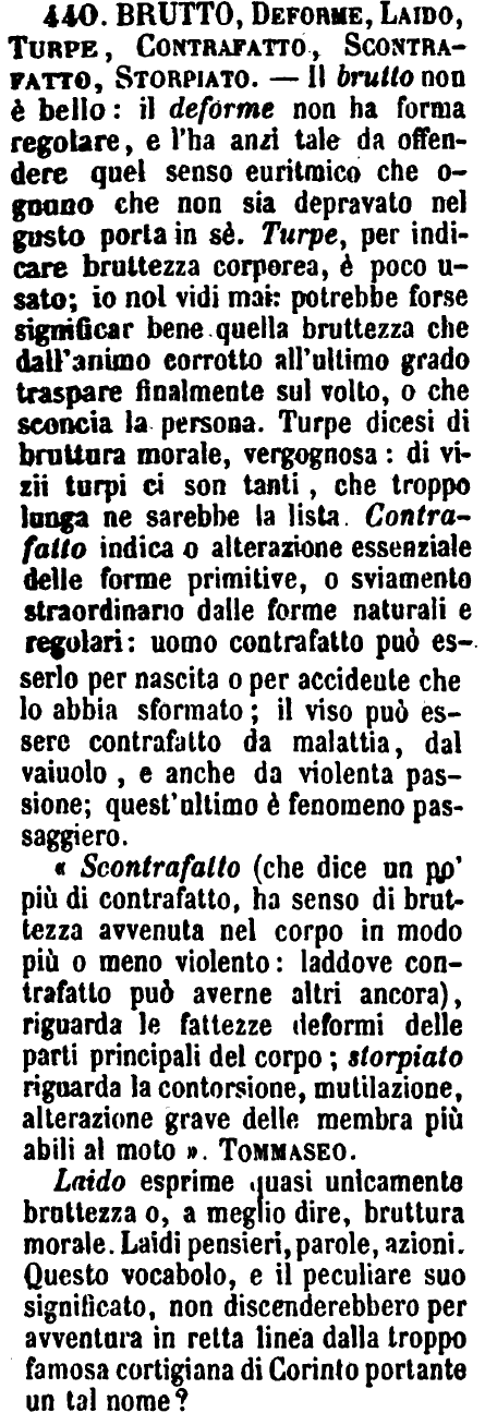 Brutto, Deforme, Laido, Turpe, Contrafatto, Scontrafatto, Storpiato - Il brutto non è bello: il deforme non ha forma regolare, e l'ha anzi tale da offendere quel senso euritmico che ognuno che non sia depravato nel gusto porta in sè. Turpe, per indicare bruttezza corporea, è poco usato; io nol vidi mai: potrebbe forse significar bene quella bruttezza che dall'animo corrotto all'ultimo grado traspare finalmente sul volto, o che sconcia la persona. Turpe dicesi di bruttura morale, vergognosa: di vizii turpi ci son tanti, che troppo lunga ne sarebbe la lista. Contrafatto indica o alterazione essenziale delle forme primitive, o sviamento straordinario dalle forme naturali e regolari: uomo contrafatto può esserlo per nascita o per accidente che lo abbia sformato; il viso può essere contrafatto da malattia, dal vaiuolo, e anche da violenta passione; quest'ultimo è fenomeno passeggiero.
