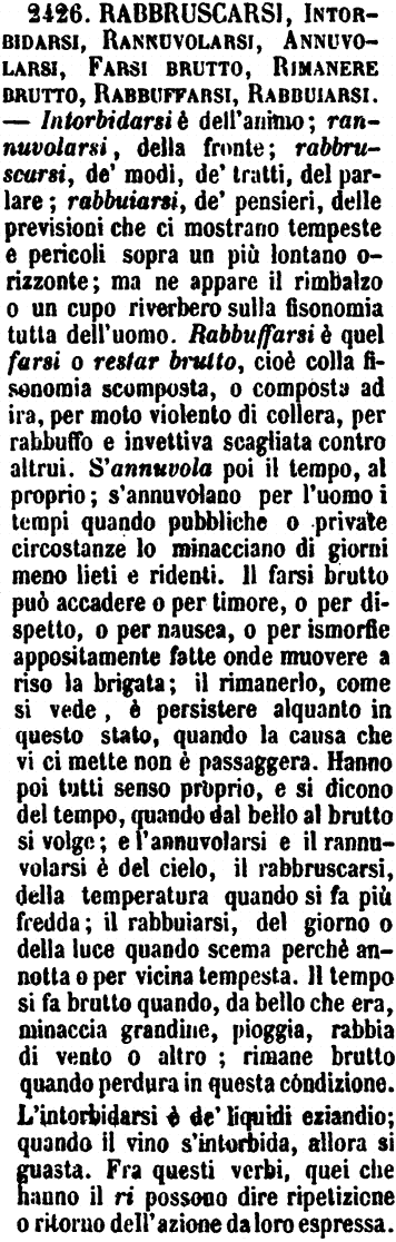 | Rabbruscarsi, Intorbidarsi, Rannuvolarsi, Annuvolarsi, Farsi brutto, Rimanere brutto, Rabbuffarsi, Rabbuiarsi - Intorbidarsi è dell'animo; rannuvolarsi, della fronte; rabbruscarsi, de' modi, de' tratti, del parlare; rabbuiarsi, de' pensieri, delle previsioni che ci mostrano tempeste e pericoli sopra un più lontano orizzonte; ma ne appare il rimbalzo o un cupo riverbero sulla fisonomia tutta dell'uomo. Rabbuffarsi è quel farsi o restar brutto, cioè colla fisonomia scomposta, o composta ad ira, per moto violento di collera, per rabbuffo e invettiva scagliata contro altrui. S'annuvola poi il tempo, al proprio; s'annuvolano per l'uomo i tempi quando pubbliche o private circostanze lo minacciano di giorni meno lieti e ridenti. Il farsi brutto può accadere o per timore, o per dispetto, o per nausea, o per ismorfie appositamente fatte onde muovere a riso la brigata; il rimanerlo, come si vede, è persistere alquanto in questo stato, quando la causa che vi ci mette non è passaggera. Hanno poi tutti senso proprio, e si dicono del tempo, quando dal bello al brutto si volge; e l'annuvolarsi e il rannuvolarsi è del cielo, il rabbruscarsi, della temperatura quando si fa più fredda; il rabbuiarsi, del giorno o della luce quando scema perchè annotta o per vicina tempesta. Il tempo si fa brutto quando, da bello che era, minaccia grandine, pioggia, rabbia di vento o altro; rimane brutto quando perdura in questa condizione. L'intorbidarsi è de' liquidi eziandio; quando il vino s'intorbida, allora si guasta. Fra questi verbi, quei che hanno il ri possono dire ripetizione o ritorno dell'azione da loro espressa. [immagine] |