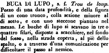 | Buca di lupo - s. f. Trou de loup. Pozzo di una data profondità, e della figura di un cono tronco, colla sezione minore al di sotto, e con uno steccone piantato nel mezzo. Le buche di lupo si scavano in tre o quattro filari, disposte a scacchiere, nel fondo del fosso, nella strada coperta, al piè dello spalto, o a traverso d'una comunicazione per difficoltare il passo al nemico. [immagine] |