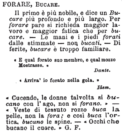 | Forare, Bucare - Il primo è più nobile, e dice un Bucare più profondo e più largo. Per forare pare si richieda maggior lavoro e maggior fatica che per bucare. - Le mani e i piedi forati dalle stimmate - non bucati. - Di ferite, bucare è troppo familiare.