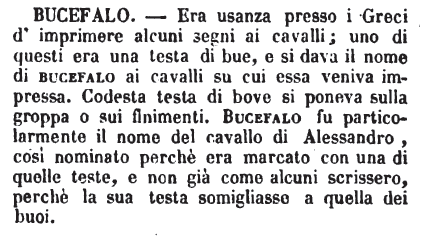 | Bucefalo - Era usanza presso i Greci d'imprimere alcuni segni ai cavalli; uno di questi era una testa di bue, e si dava il nome di bucefalo ai cavalli su cui essa veniva impressa. Codesta testa di bove si poneva sulla groppa o sui finimenti. Bucefalo fu particolarmente il nome del cavallo di Alessandro, così nominato perchè era marcato con una di quelle teste, e non già come alcuni scrissero, perchè la sua testa somigliasse a quella dei buoi. [immagine] |