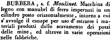 | Burbera - s. f. Moulinet. Macchina di legno con manubrî di ferro impernati in un cilindro posto orizzontalmente, intorno a cui s'avvolge il canape per uso d'estrarre i materiali prodotti dallo scavamento dei pozzi delle mine, ed altrove in varie operazioni nelle fabbriche. [immagine] |