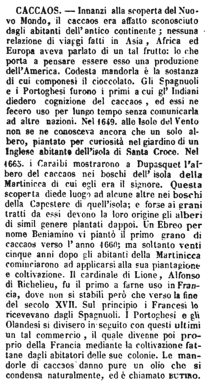 | Caccaos - Innanzi alla scoperta del Nuovo Mondo, il caccaos era affatto sconosciuto dagli abitanti dell'antico continente; nessuna relazione di viaggi fatti in Asia, Africa ed Europa aveva parlato di un tal frutto: lo che porta a pensare essere esso una produzione dell'America. Codesta mandorla è la sostanza di cui componesi il cioccolato. Gli Spagnuoli e i Portoghesi furono i primi a cui gl'Indiani diedero cognizione del caccaos, ed essi ne fecero uso per lungo tempo senza comunicarla ad altre nazioni. Nel 1649. alle Isole del Vento non se ne conosceva ancora che un solo albero, piantato per curiosità nel giardino di un Inglese abitante dell'isola di Santa Croce. Nel 1663. i Caraibi mostrarono a Dupasquet l'albero del caccaos nei boschi dell'isola della Martinicca di cui egli era il signore. Questa scoperta diede luogo ad alcune altre nei boschi della Capestere di quell'isola; e forse ai grani tratti da essi devono la loro origine gli alberi di simil genere piantati dappoi. Un Ebreo per nome Beniamino vi piantò il primo grano di caccaos verso l'anno 1660; ma soltanto venti cinque anni dopo gli abitanti della Martinicca cominciarono ad applicarsi alla sua piantagione e coltivazione. Il cardinale di Lione, Alfonso di Richelieu, fu il primo a farne uso in Francia, dove non si stabilì però che verso la fine del secolo XVII. Sul principio i Francesi lo ricevevano dagli Spagnuoli. I Portoghesi e gli Olandesi si divisero in seguito con questi ultimi un tal commercio, il quale divenne poi proprio della Francia mediante la coltivazione fattane dagli abitatori delle sue colonie. Le mandorle di caccaos danno pure un olio che si condensa naturalmente, ed è chiamato butiro. [immagine] |