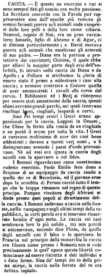 | Caccia - E' questo un esercizio a cui si sono sempre dati gli uomini con molta passione. La Scrittura concorda con la Favola per rappresentare sino dall'epoche più remote gli uomini facienti guerra agli animali onde cuoprirsi delle loro pelli e della loro carne cibarsi. Nemrod, nepote di Noè, era un gran cacciatore; Ismaele, figlio di Abramo e di Agar, vi si distinse particolarmente; e David moveva guerra agli animali che assalivano gli armenti di suo padre. - Diana era la patrona o protettrice dei cacciatori; Chirone, il quale ebbe per allievi la maggior parte degli eroi dell'antichità, fu istruito nella caccia da Diana e da Apollo; a Polluce si attribuisce la gloria di essere stato il primo a addestrare i cani alla caccia; e nessuno contrasta a Castore quella di aver ammaestrati i cavalli alla corsa del cervio. I Babiloniesi ed i Medj si ritengono per essere stati amantissimi della caccia; questi ultimi avevano grandi parchi, nei quali tenevano rinchiusi leoni, cinghiali, leopardi e cervi.