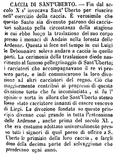 | Caccia di Sant’Uberto - Fin dal secolo X s'invocava Sant'Uberto per riuscire nell'esercizio della caccia. E' verosimile che questo Santo sia divenuto patrono dei cacciatori soltanto pella circostanza della stagione in cui ebbe luogo la traslazione del suo corpo presso i monaci di Andain nella foresta delle Ardenne. Questa si fece nel tempo in cui Luigi le Debonnaire soleva andare a caccia in quelle parti. La cerimonia della traslazione diede nascimento al famoso pellegrinaggio di Sant'Uberto; i cacciatori che accompagnavano il re vi presero parte, e indi comunicarono la loro divozione ad altri cacciatori del regno. Ciò che maggiormente contribuì ai progressi di questa divozione tosto che fu incominciata, si fu l'opinione sorta in allora che Sant'Uberto stesso fosse stato cacciatore innanzi di essere vescovo di Liegi. La divozione fondata su questo principio divenne così grande in tutta l'estensione delle Ardenne, anche prima del secolo XI., che era costume adottato universalmente presso tutti i signori di quel paese di offrire a S. Uberto le primizie della loro caccia, e fargli dono della decima parte del selvaggiume che prendevano ogni anno. [immagine] |