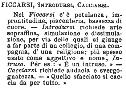 | Usando "cacciarsi" (*) si possono ottenere i seguenti risultati: * scocciarsi = casco; * morsi = cacciamo; * tersi = cacciate; * tirsi = cacciati; * torsi = cacciato; forarsi * = forcacci; * lesi = cacciarle; * lisi = cacciarli; * misi = cacciarmi; capirsi * = capicaccia. |