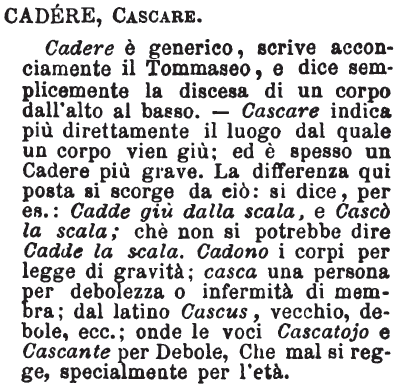 | Cadere, Cascare - Cadere è generico, scrive acconciamente il Tommaseo, e dice semplicemente la discesa di un corpo dall'alto al basso. - Cascare indica più direttamente il luogo dal quale il corpo vien giù; ed è spesso un Cadere più grave. La differenza qui posta si scorge da ciò: si dice, per es.: Cadde giù dalla scala, e Cascò la scala; chè non si potrebbe dire Cadde la scala. Cadono i corpi per legge di gravità; casca un persona per debolezza o infermità di membra; dal latino Cascus, vecchio, debole, ecc.; onde le voci Cascatojo e Cascante per Debole, Che mal si regge, specialmente per l'età. [immagine] |