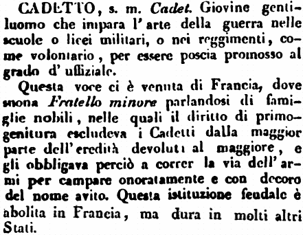 Questa voce ci è venuta di Francia, dove suona Fratello minore parlandosi di famiglie nobili, nelle quali il diritto di primogenitura escludeva i Cadetti dalla maggior parte dell'eredità devoluti al maggiore, e gli obbligava perciò a correr la via dell'armi per campare onoratamente e con decoro del nome avito. Questa istituzione feudale è abolita in Francia, ma dura in molti altri Stati. [immagine] |