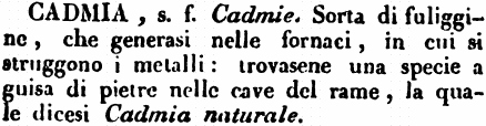 | Cadmia - s. f. Cadmie. Sorta di fuliggine, che generasi nelle fornaci, in cui si struggono i metalli: trovasene una specie a guisa di pietre nelle cave del rame, la quale dicesi Cadmia naturale. [immagine] |