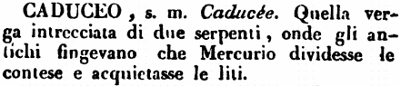 | Caduceo - s. m. Caducée. Quella verga intrecciata di due serpenti, onde gli antichi fingevano che Mercurio dividesse le contese e acquietasse le liti. [immagine] |