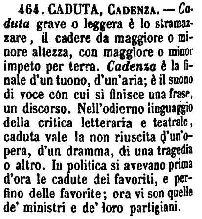 | Caduta, Cascata - Caduta, detto d'animali o di persone, è men grave e men pericolosa di Cascata e non è sempre dall'alto come questa. Delle acque è oggi più comune Cascata. Dei gravi dall'alto si dice sempre Caduta nel linguaggio scientifico. - Nel traslato quasi sempre Caduta. G. F. [immagine] |