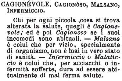 | Cagionevole, Cagionoso, Malsano, Infermiccio - Chi per ogni piccola cosa si trova alterata la salute, quegli è Cagionevole; ed è poi Cagionoso se i suoi incomodi sono abituali. - Malsano è colui che per vizio, specialmente di organismo, non è mai in vero stato di sanità. - Infermiccio o Malaticcio è colui che, per acciacchi o infermità sofferte, dura ad essere abitualmente di mal ferma salute. [immagine] |