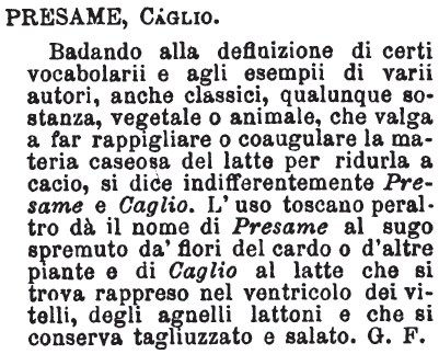 | Presame, Caglio - Badando alla definizione di certi vocabolarii e agli esempii di varii autori, anche classici, qualunque sostanza, vegetale o animale, che valga a far rappigliare o coagulare la materia caseosa del latte per ridurla a cacio, si dice indifferentemente Presame e Caglio. L'uso toscano peraltro dà il nome di Presame al sugo spremuto da' fiori del cardo o d'altre piante e di Caglio al latte che si trova rappreso nel ventricolo dei vitelli, degli agnelli lattoni e che si conserva tagliuzzato e salato. G. F. [immagine] |