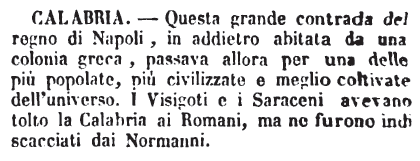 | Calabria - Questa grande contrada del regno di Napoli, in addietro abitata da una colonia greca, passava allora per una delle più popolate, più civilizzate e meglio coltivate dell'universo. I Visigoti e i Saraceni avevano tolto la Calabria ai Romani, ma ne furono indi scacciati dai Normanni. [immagine] |