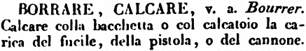 | Borrare, Calcare - v. a. Bourrer. Calcare colla bacchetta o col calcatoio la carica del fucile, della pistola, o del cannone. [immagine] |