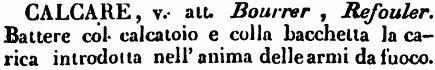 | Calcare - v. att. Bourrer, Refouler. Battere col calcatoio e colla bacchetta la carica introdotta nell'anima delle armi da fuoco. [immagine] |