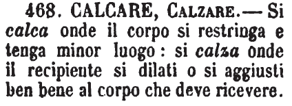 | Calcare, Calzare - Si calca onde il corpo si restringa e tenga minor luogo: si calza onde il recipiente si dilati o si aggiusti ben bene al corpo che deve ricevere. [immagine] |