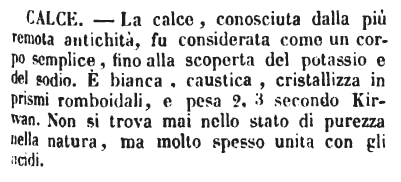 | Calce - La calce, conosciuta dalla più remota antichità, fu considerata come un corpo semplice, fino alla scoperta del potassio e del sodio. E' bianca, caustica, cristallizza in prismi romboidali, e pesa 2.3 secondo Kirwan. Non si trova mai nello stato di purezza nella natura, ma molto spesso unita con gli acidi. [immagine] |