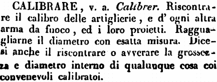 Calibrare - V. a. (Mil.) Misurare la portata delle artiglierie, cioè il diametro dell'anima di qualche pezzo. (Dal lat. Cum, e da Librare, Ponderare, Esaminare, Misurare.) (Mt.) Altri dall' arab. Kalib, Modello.