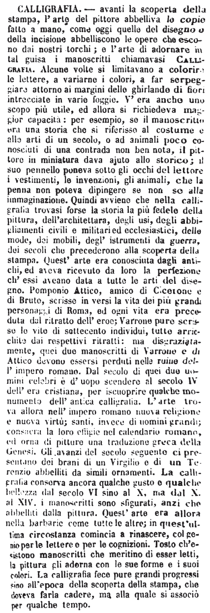 | Calligrafia - avanti la scoperta della stampa, l'arte del pittore abbelliva le copie fatte a mano, come oggi quelle del disegno e della incisione abbelliscono le opere che escono dai nostri torchi; e l'arte di adornare in tal guisa i manoscritti chiamavasi Calligrafia. Alcune volte si limitavano a colorire le lettere, a variarne i colori, a far serpeggiare attorno ai margini delle ghirlande di fiori intrecciate in varie foggie. V'era anche uno scopo più utile, ed allora si richiedeva maggior capacità: per esempio, se il manoscritto era una storia che si riferisse al costume e alle arti di un secolo, o ad animali poco conosciuti di una contrada non ben nota, il pittore in miniatura dava ajuto allo storico; il suo pennello poneva sotto gli occhi del lettore i vestimenti, le invenzioni, gli animali, che la penna non poteva dipingere se non se alla immaginazione. Quindi avviene che nella calligrafia trovasi forse la storia la più fedele della pittura, dell'architettara, degli usi, degli abbigliamenti civili e militari ed ecclesiastici, delle mode, dei mobili, degl'istrumenti da guerra, dei secoli che precederono alla scoperta della stampa. Quest'arte era conosciuta dagli antichi, ed aveva ricevuto da loro la perfezione ch'essi aveano data a tutte le arti del disegno. Pomponio Attico, amico di Cicerone e di Bruto, scrisse in versi la vita dei più grandi personaggi di Roma, ed ogni vita era preceduta dal ritratto dell'eroe; Varrone pure scrisse le vite di settecento individui, tutte arricchite dai respettivi ritratti: ma disgraziatamente, quei due manoscritti di Varrone e di Attico devono essersi perduti nelle ruine dell'impero romano. Dal secolo di quei due uomini celebri è d'uopo scendere al secolo IV dell'era cristiana, per iscuoprire qualche monumento dell'antica calligrafia. L'arte trova allora nell'impero romano nuova religione e nuova virtù; santi, invece di uomini grandi; consacra la loro effigie nel calendario romano, ed orna di pitture una traduzione greca della Genesi. Gli avanzi del secolo seguente ci presentano dei brani di un Virgilio e di un Terenzio abbelliti da simili ornamenti. La calligrafia conserva ancora qualche gusto e qualche bellezza dal secolo VI sino al X, ma dal X. al XIV. i manoscritti sono sfigurati, anzi che abbelliti dalla pittura. Quest'arte era allora nella barbarie come tutte le altre; in quest'ultima circostanza comincia a rinascere, col genio per le lettere e per le cognizioni. Tosto ch'esistono manoscritti che meritino di esser letti, la pittura gli adorna con le sue forme e i suoi colori. La calligrafia fece pure grandi progressi sino all'epoca della scoperta della stampa, che doveva farla cadere, ma alla quale si associò per qualche tempo. [immagine] |
