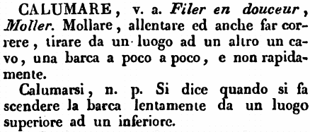 Calumare - v. a. Filer en douceur, Moller. Mollare, allentare ed anche far correre, tirare da un luogo ad un altro un cavo, una barca a poco a poco, e non rapidamente.