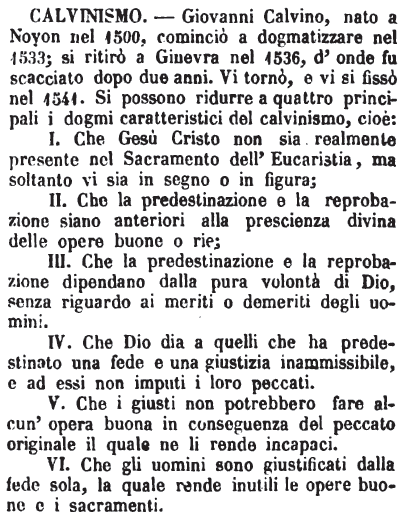 Calvinismo - Giovanni Calvino, nato a Noyon nel 1500, cominciò a dogmatizzare nel 1533; si ritirò a Ginevra nel 1536, d'onde fu scacciato dopo due anni. Vi tornò, e vi si fissò nel 1541. Si possono ridurre a quattro principali i dogmi caratteristici del calvinismo, cioè: