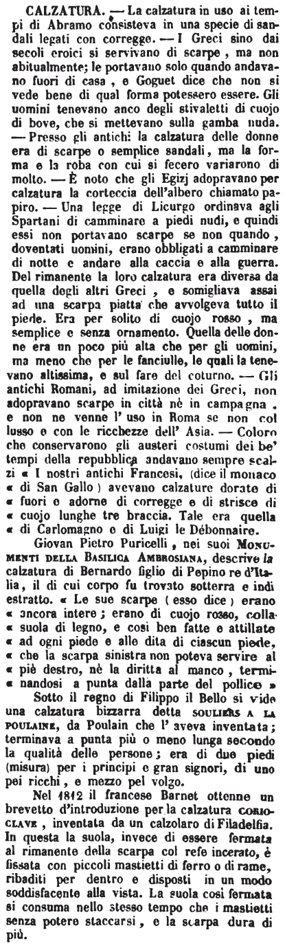 Nel 1812 il francese Barnet ottenne un brevetto d'introduzione per la calzatura corioclave, inventata da un calzolaro di Filadelfia. In questa la suola, invece di essere fermata al rimanente della scarpa col refe incerato, è fissata con piccoli mastietti di ferro o di rame, ribaditi per dentro e disposti in un modo soddisfacente alla vista. La suola così fermata si consuma nello stesso tempo che i mastietti senza potere staccarsi, e la scarpa dura di più. [immagine] |