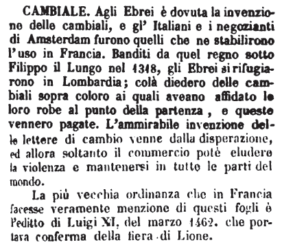 Cambiale - Agli Ebrei è dovuta la invenzione delle cambiali, e gl'Italiani e i negozianti di Amsterdam furono quelli che ne stabilirono l'uso in Francia. Banditi da quel regno sotto Filippo il Lungo nel 1318, gli Ebrei si rifugiarono in Lombardia; colà diedero delle cambiali sopra coloro ai quali aveano affidato le loro robe al punto della partenza, e queste vennero pagate. L'ammirabile invenzione delle lettere di cambio venne dalla disperazione, ed allora soltanto il commercio potè eludere la violenza e mantenersi in tutte le parti del mondo.