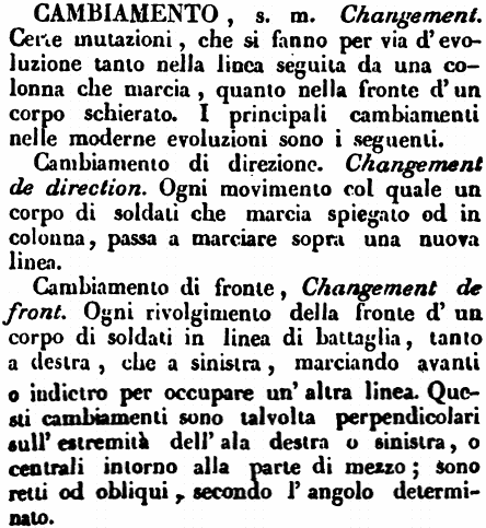 | Cambiamento - s. m. Changement. Certe mutazioni, che si fanno per via d'evoluzione tanto nella linea seguita da una colonna che marcia, quanto nella fronte d'un corpo schierato. I principali cambiamenti nelle moderne evoluzioni sono i seguenti.